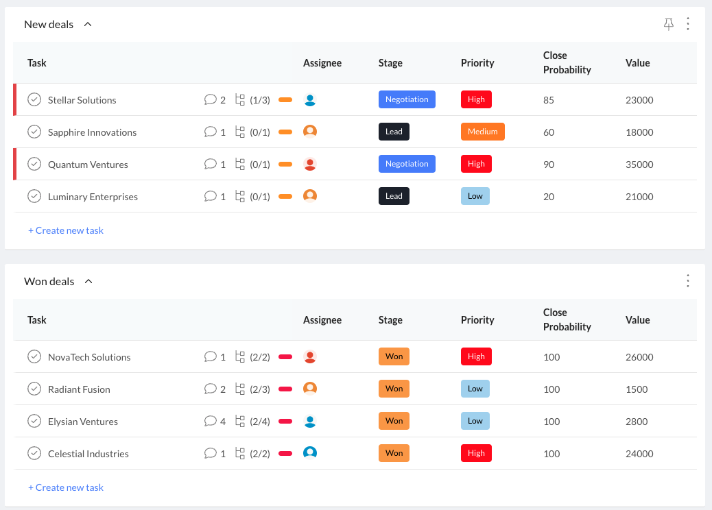 New deals: Add new deals to this list, specifying the deal name, associated company or contact, and any relevant details. Update the stage, priority, close probability, and value fields as the deal progresses.