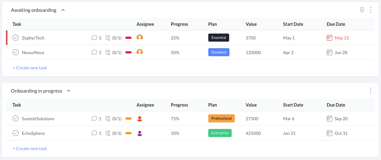 Onboarding in progress: Move the customers actively onboarded to the "Onboarding in progress" list. Assign tasks and set start dates and due dates for each task.