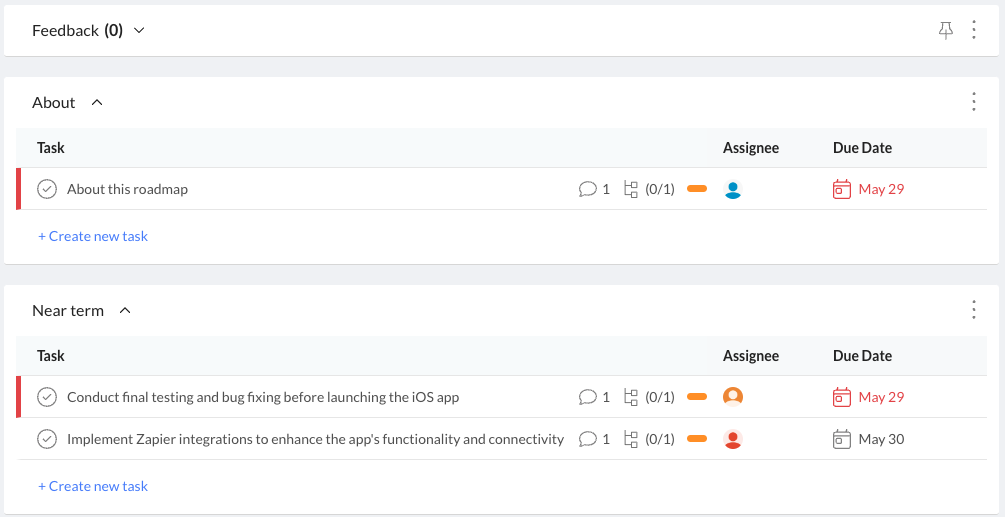 Feedback: Use this list to gather feedback regarding the project's progress, deliverables, and overall direction. Consider their input when making decisions or refining the roadmap.