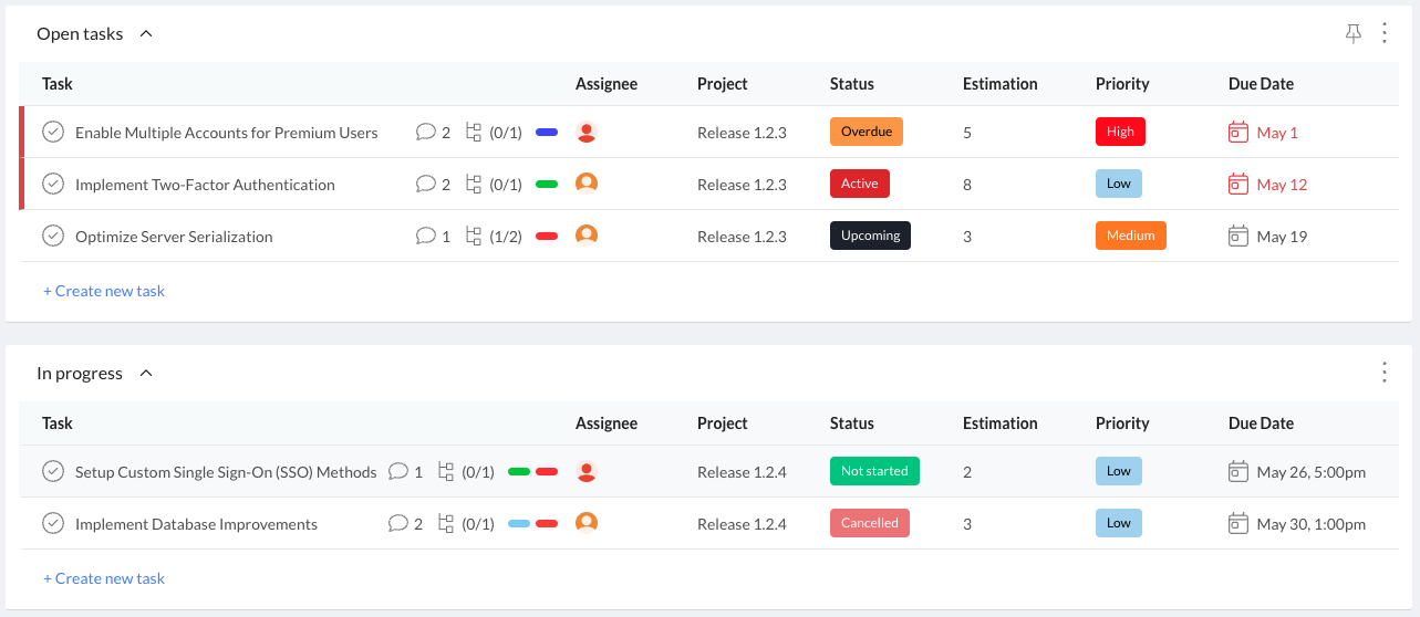 Status: Use this field to track the progress of each iteration, such as upcoming, pending, overdue, not started, active, or canceled.