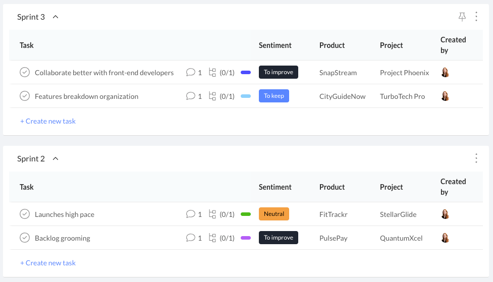Sentiment: Use this field to indicate the sentiment associated with the action item. Choose from options like "to improve" (highlighting areas that need enhancement), "to keep" (acknowledging successful practices to continue), or "neutral" (items requiring further discussion).